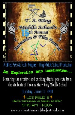 King Family, you are all welcome to the 15th Annual Animation & Film Festival at the Los Feliz 3 Theatre on Sunday, June 3rd from 9:45am till noon. This is a free event where you will be able to enjoy the best and award winning film and animation projects from King this year, all made possible by Vintage Cinema Inc, the Los Feliz Improvement Association and our very creative students.